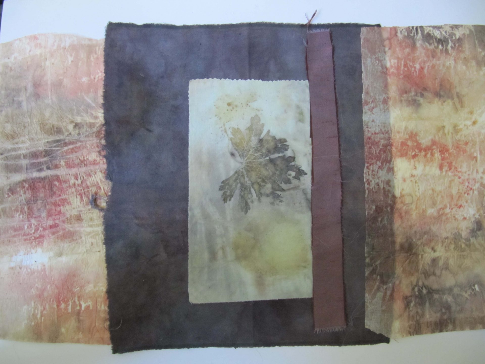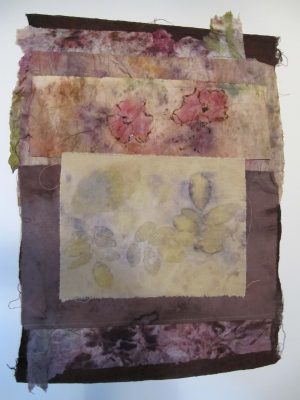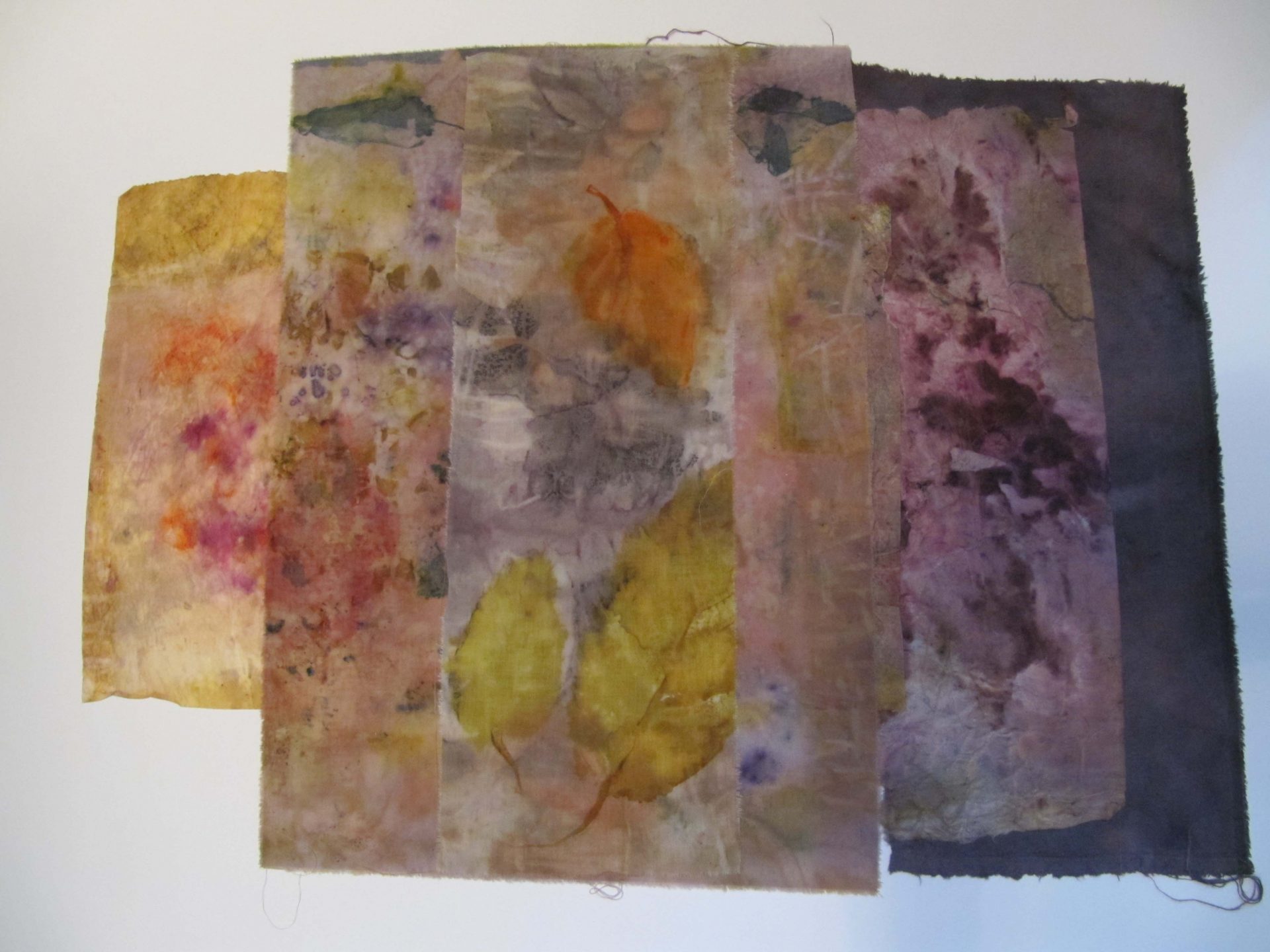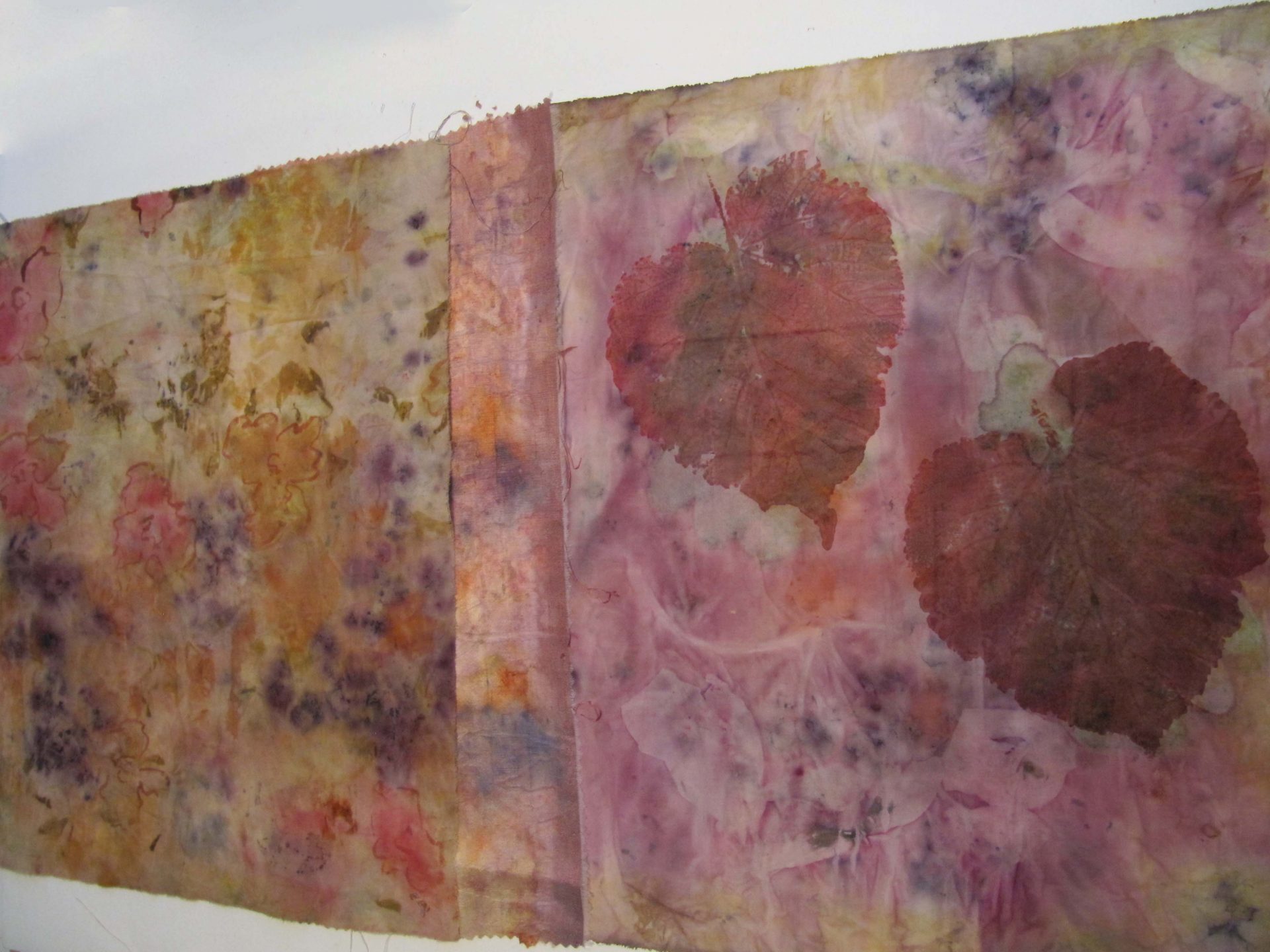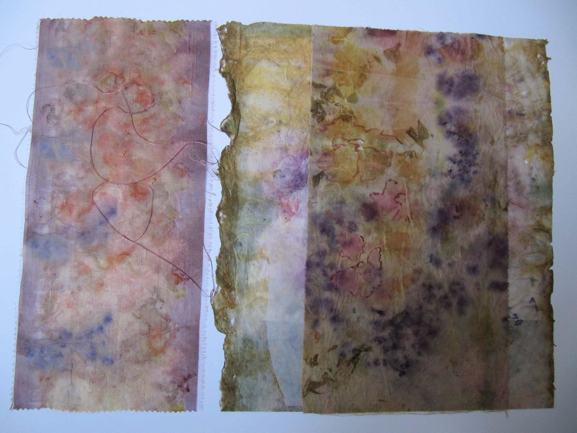 J’utilise des plantes tinctoriales par bains de teintures, shibori, éco-print, impressions, sur washi, soie, coton.